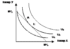 U2 – равновесная кривая безразличия, т.Е – точка равновесия потребителя в ординалистской теории. Эту точку можно найти через предельную норму замещения.