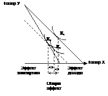 Общий эффект в результате изменения цены распадается на две части. Эффект замещения показывает изменение структуры потребительского спроса в результате изменения цены одного из товаров, входящих в потребительских набор без учета эффекта дохода.
