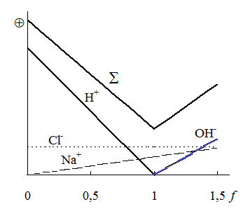 Рис. 25.5. Кривая титрования HCl раствором NaOH с указанием вкладов отдельных ионов (без учёта разбавления раствора) |