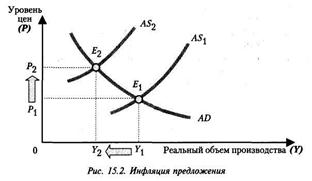 Инфляцию предложения вызывают те причины, которые способствовали смещению кривой совокупного предложения влево. Они были рассмотрены ранее при изучении совокупного спроса и предложения.