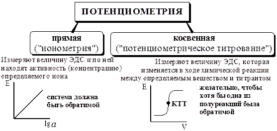 При потенциометрических измерениях используется электрохимическая ячейка, работающая в режиме гальванического элемента. В состав ячейки входит индикаторный электрод, потенциал которого зависит от активности определяемого иона или от активности хотя бы одного из компонентов протекающей химической реакции, и электрод сравнения (чаще всего хлоридсеребряный), величина потенциала которого постоянна. Величина потенциала индикаторного электрода связана с активностью определяемого иона уравнением Нернста (см. главу 7).