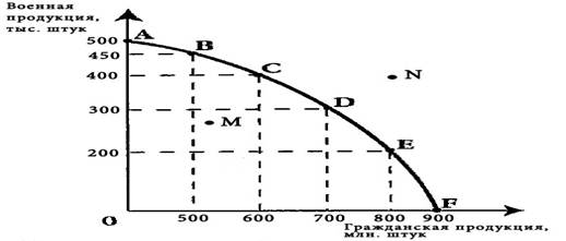 Таким образом, при максимальном уровне производственных возможностей общество не в состоянии одновременно увеличить военное и гражданское производство и переместиться в точку N, поэтому кривую производственных возможностей в экономической теории часто называют границей производственных возможностей.