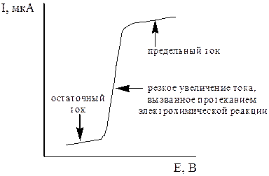 Классическая полярограмма имеет 3 участка. Первый участок, от начала регистрации полярограммы до начала электрохимической реакции, называется остаточным током. Его появление обусловлено образованием на поверхности ртути двойного электрического слоя (молекулярного конденсатора), а также восстановлением электроактивных примесей (например, O2).