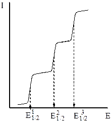 Если в растворе присутствует несколько электроактивных веществ, имеющих различные величины E1/2, то полярограмма может выглядеть так, как показано на рис. 27.3.