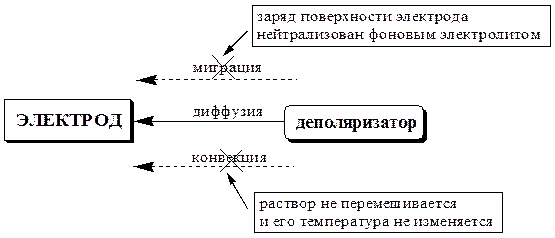 Измерения в вольтамперометрии проводятся в таких условиях, чтобы перемещение частиц определяемого электроактивного вещества («деполяризатора») к поверхности электрода происходило только за счёт диффузии.