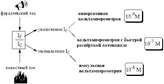 Нижняя граница определяемых концентраций в классической полярографии составляет ~ 10-5 М. Её значение обусловлено величиной отношения фарадеевского тока, связанного с протеканием электродной реакции с участием определяемого вещества, к ёмкостному току (одному из компонентов остаточного тока). При увеличении отношения IF/IC нижняя граница определяемых концентраций также уменьшается.