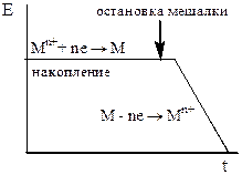 | Инверсионная вольтамперометрия(обычно анодная) | Вначале в течение строго определённого времени проводят электролиз анализируемого раствора. Некоторое количество определяемого вещества при этом восстанавливается и накапливается в (на) электроде. После окончания электролиза выключают мешалку и дают раствору успокоиться. Затем потенциал линейно уменьшают и регистрируют зависимость анодного тока от Е. |