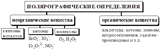 Поскольку ртутный капающий электрод может быть использован только в области отрицательных потенциалов, в основе полярографических определений обычно лежат реакции восстановления. Методом классической полярографии можно определять: