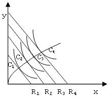 При увеличении реального дохода потребителя происходит равномерное смещение бюджетной линии вправо и вверх. С1, С2, С3, С4 - параметры рыночного равновесия при различных уровнях дохода. Соединив их, получим линию «доход-потребление».