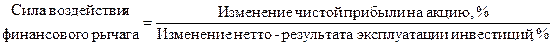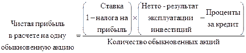 С помощью этой формулы отвечают на вопрос, на сколько процентов изменится чистая прибыль на каждую обыкновенную акцию при изменении нетто-результата эксплуатации инвестиций (прибыльности) на один процент.