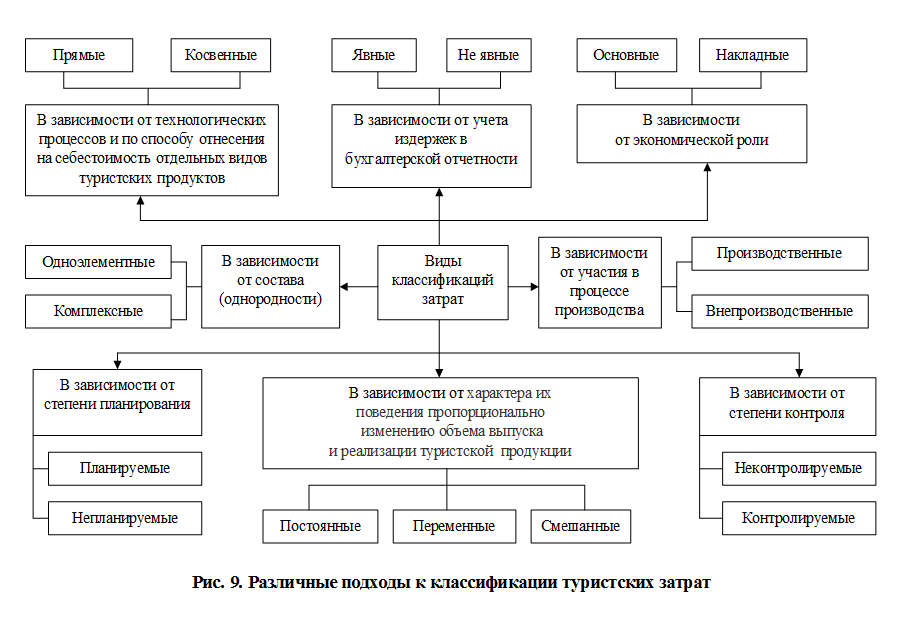 Использование системы классификации затрат позволяет анализировать и прогнозировать показатели продаж и чистого дохода по туристской организации в целом и по отдельным видам турпродукта, по клиентам и продавцам, по каналам реализации и другим категориям. Такое разбиение данных применяется в управлении себестоимостью, при планировании прибыли и оценке качества работы, а также для контроля затрат. Вся эта информация объективно необходима менеджерам для управленческого учета. Основой каждой из классификаций затрат является информация для оценки использования производственных ресурсов, данные о затратах для принятия управленческих решений и сведения о затратах для контроля и регулирования. Для того чтобы лучше понять характер поведения затрат, проведем их классификацию по нескольким базовым признакам. Так существуют следующие классификации затрат в сфере туризма (Рис. 9):
