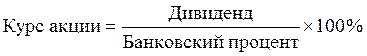 Акция имеет номинальную и рыночную стоимости. Цена акции, обозначенная на ней, является номинальной стоимостью акции. Цена, по которой реально покупается акция, называется рыночной ценой, или курсовой стоимостью. Курс акции находится в прямой зависимости от размера получаемого по ним дивиденда и в обратной зависимости от уровня банковского процента за кредит: