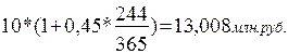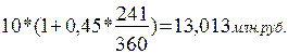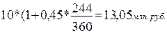 Предположим, что ссуда в размере 10 млн. руб. выдана 1 мая с возвратом 31 декабря этого же года под 45% годовых (простая процентная ставка). Определим наращенную сумму этого кредита по каждому из трех способов. Табличное значение точной длительности ссуды равно 244 дням (365 - 121); приближенная длительность - 241 день (6 * 30 + 30 + 30 + 1):