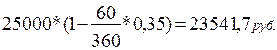 Пусть владелец векселя номиналом 25 000 руб. обратился в банк с предложением учесть его за 60 дней до наступления срока погашения. Банк согласен выполнить эту операцию по простой учетной ставке 35% годовых. Выкупная цена векселя составит: