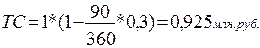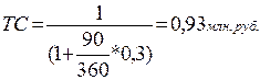 Покупатель обязуется оплатить поставщику стоимость закупленных товаров через 90 дней после поставки в сумме 1 млн. руб. Уровень простой процентной ставки составляет 30% годовых (обыкновенные проценты). Следовательно, текущая стоимость товаров будет равна