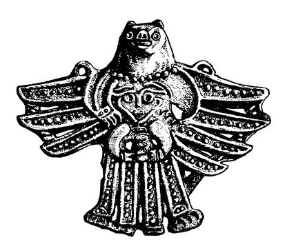 На птицевидных привесках, видимо, украшавших шаманский костюм, часто изображались человеческие фигурки шаманов, переносимых птицами-помощниками на небо: так обско-угорская птица Карс переносила главного покровителя людей, мифологического всадника Мир-сусне-хума. Этот изобразительный образ также имеет иранские аналогии в синхронных изобразительных памятниках: важно, что именно в раннесредневековый период (VI–VII вв.) Пермская земля оказалась тесно связанной с Сасанидским Ираном и получала оттуда в обмен на меха шедевры декоративного искусства, которые украшают ныне коллекцию Эрмитажа. Среди них — серебряное блюдо с изображением орла (с собачьими ушами Сенмурва), который несет в когтях женщину, протягивающую ему кисть винограда. Исследователи гадают, что означает этот сюжет — то ли похищение хаомы, то ли упомянутый в иранской священной книге «Авеста» миф о некоем лодочнике, который превратился в коршуна и поднялся на небо, но не смог спуститься на землю, пока Ардвисура Анахита не вернула ему человеческий облик. Важно, что с этой композицией были знакомы мастера Прикамья.