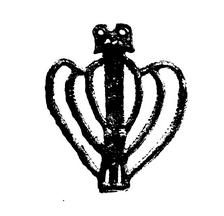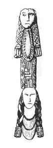 Более распространенный образ пермского звериного стиля — птица с распростертыми крыльями и человеческой личиной на груди — «шаманский дух», возносящий шамана на небо. Головка одной из таких птиц увенчана собачьими ушами Симурга, или Сенмурва. Устрашающего вида личина венчает «идол» такого крылатого шаманского духа, найденный в земле Коми: на его тулове изображена схематически человеческая фигурка самого шамана. И уж совершенно фантастическим оказывается образ птицы с тремя головами и личиной на груди: личину окаймляют головы лося, крылья птицы также оформлены в виде лосиных голов. Это химерическое существо призвано было проникать во все три зоны космоса и служило воплощенным символом этих зон.
