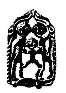 На птицевидных привесках шаманского костюма изображались не только личины и человеческие фигурки: на одной из них помещено изображение лошади, на другой — человек и лошадь. Конь вполне мог быть священным животным — помощником шамана: ведь последнему нужно было передвигаться не только по вертикали — на небеса, но и по горизонтали — по земле. Наконец, шаманская личина изображена также между двух хтонических тварей — ящеров или бобров; оно и понятно, ведь шаману нужно было проникать и в преисподнюю. Более наглядно это сошествие шамана в преисподнюю изображено литыми фигурками, где человек оказывается сидящим на ящере. На одной из причудливых ажурных пермских блях человек в шаманском головном уборе в виде головы лося сидит верхом на ящере, туловище которого покрыто изображениями рыб. Вспомним, что ящер (впрочем, некоторые исследователи считают, что это выдра) воплощал не только преисподнюю, но и подводное царство. Над сидящим шаманом изображены три летящие птицы с собачьими головами. Вновь три зоны мифологического космоса воплощены в зооморфных образах.