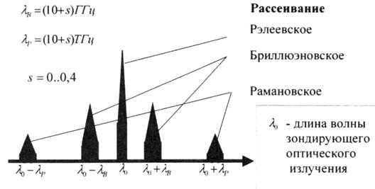 Принцип работы подобных рефлектометров основан на измерении параметров обратного бриллюэновского рассеяния. Известно, что наряду с рэлеевским рассеянием в оптическом волокне имеет место рассеяние с длиной волны отличной от длины волны падающего света. Его называют стоксовским светом, если сдвиг длины волны положительный, и антистоксовским (обратым стоксовским), если сдвиг длины волны отрицательный. Это, в частности, рамановское и бриллюэновское рассеяние света. Рэлеевское рассеяние- это рассеяние на неподвижных неоднородностях (флюктуациях показателя преломления), обусловленных технологией изготовления оптического волокна. Длина волны рэлеевского рассеяния совпадает с длиной волны падающего света. Рамановское и бриллюэновское рассеяние- это рассеяние на подвижнох неоднородностях, связанных с колебаниями атоов в кристаллической решетки и акустическими волнами. В силу эффекта Допплера свет отраженный от подвижного объекта сдвиут по длине волны относительно падающего. Соответственно длины волн рамановского и бриллюэновского рассеяния отличаются от длины волны падающего света (рисунок 10.28).