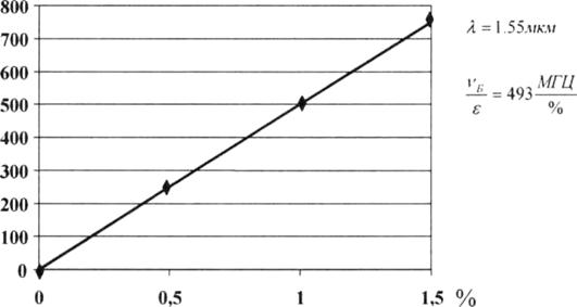 Отсюда следует, что сдвиг частоты бриллюэновского рассеяния пропорционален внутреннему механическому напряжению в волокне. На рис. 10.30 представлена зависимость сдвига частот бриллюэновского рассеяния для чистого кварца на длине волны зондирующего сигнала 1,55 мкм в зависимости от выраженных в процентах относительного удлинения волокна внутренних механических напряжений в стекле [20].