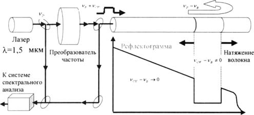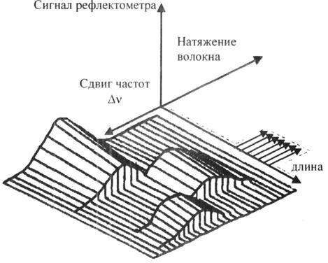 Измеряя методами рефлектометрии зависимость от времени сдвига частот сигнала обратного бриллюэновского рассеяния в волокне относительно частоты (длины волны) зондирующего сигнала, можно получить распределение внутренних механических напряжений вдоль волокна (рис. 10.28), что позволяет, как было отмечено ранее, оценивать состояние волокна, прогнозировать его срок службы, выявлять поврежденные участки [28].