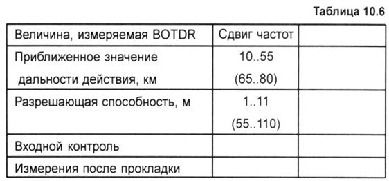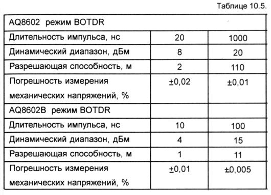 Из-за необходимости подключения одновременно с двух сторон линии ВОTDА не находят применения на оптических сетях связи. Здесь предпочтение отдано системам ВОTDR. Сегодня данные средства измерений представлены на рынке приборами АQ8602/8602В производства фирмы Ando. Данный прибор выполняет как функции когерентного оптического рефлектометра обратного рэлеевского рассеяния (СОTDR АQ8602), так и бриллюэновского оптического рефлектометра (ВОТDR АQ8602В), обеспечивая измерение оценок затухания, распределения механических напряжений, расстояний до различного вида нерегулярностей оптических волокон. Основные технические данные прибора сведены в таблице 10.5.