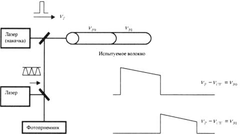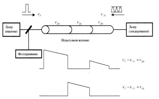 Известно два способа измерения временной характеристики частотного сдвига сигнала бриллюэновского рассеяния, реализуемые с помощью работающих во временной области анализаторов спектра сигналов бриллюэновского рассеяния (brilloun optical time domain analisys - ВОТDА) и работающих во временной области оптических рефлектометров обратного бриллюэновского рассеяния (brilloun optical time domain reflectometer- ВОТDR). Разницу в принципах работы ВОТDАи ВОТDR поясняют рисунки 10.29,10.30.