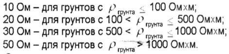 Сопротивление измерительного заземляющего устройства не должно быть более 100 Ом в грунтах с удельным сопротивлением до 100 Омхм и не более 200 Ом - в грунтах с удельным сопротивлением более 100 Омхм.