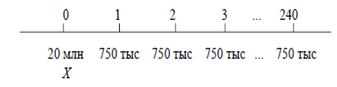 Пример 7. При приобретении дома необходимо заплатить 20 млн. руб. В день покупки и выплачивать 750 тыс. руб. ежемесячно в течение следующих 20 лет. Если деньги стоят j12 = 6%, какова стоимость дома на день покупки?