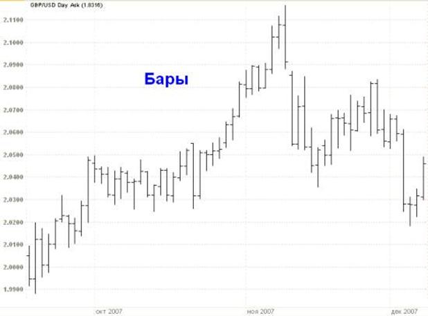 Столбиковый график, называемый гистограммой, (рис.6.2) показывает цену открытия, максимум, минимум и цену закрытия. Это самый распространённый тип, применяемый в анализе ценных бумаг. На столбиковом графике видно, что верхняя точка каждого из вертикальных столбиков представляет собой максимальную цену за данный период, а нижняя – минимальную. Чёрточка с левой стороны столбика обозначает цену открытия, а с правой – закрытия. Гистограммы полезны своей репрезентативностью и помогают сделать наилучшие прогнозы с помощью классических трендовых и поворотных фигур, скользящих средних и т.д. Для любого метода, применённого к столбиковому графику, получится наибольшее количество сигналов и наиболее точное совпадение с расчётными ценовыми уровнями.
