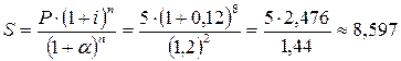 Пример решения задачи. Найти реальную стоимость накоплений с учетом инфляции, если инвестор имеет 5 млн рублей и вкладывает сроком на два года с учетом ежеквартальной капитализации. Доход исчисляется из расчета 48 % годовых. Индекс инфляции за год составил 120 %.
