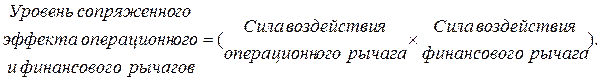 По мере одновременного увеличения силы воздействия операционного и финансового рычагов все менее значительные изменения физического объема реализации и выручки приводят к все более масштабным изменениям чистой прибыли на акцию. Это выражается в формуле сопряженного эффекта операционного и финансового рычагов