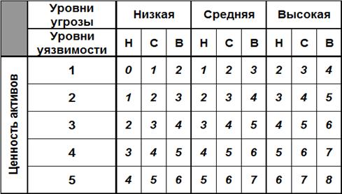 Суть подхода заключается в определении наиболее критичных активов в организации с точки зрения рисков ИБ по «штрафным баллам». Оценивание рисков производится экспертным путем на основе анализа ценности активов, возможности реализации угроз и использования уязвимостей, определенных в предыдущих пунктах. Для оценивания предлагается, например, таблица с заранее предопределенными «штрафными баллами» для каждой комбинации ценности активов, уровня угроз и уязвимостей (табл. 8).