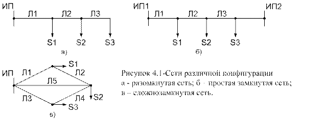 По конфигурации электрические сети подразделяются на замкнутые и разомкнутые. Примеры сетей различной конфигурации показаны на рисунке 4.1.
