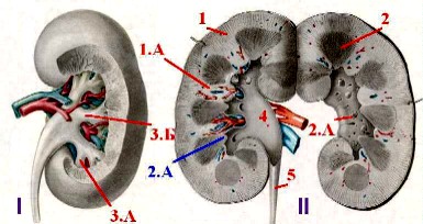 | Состав парен- химы | Под капсулой в почке находится паренхима, включающая а) корковое вещество (1-1.А), б) мозговое вещество (2-2.А), в) внутрипочечные мочевыводящие пути - | Полный размер |