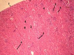 б) Это мозговые лучи (5); в их составе находятся: собирательные трубочки (6) – самые крупные из канальцев почки, а также канальцы (тонкие и дистальные прямые), образующие петли Генле корковых нефронов – коротких и промежуточных. |