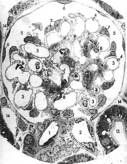 и их эндотелиоциты (8; отмечены ядросодержащие части клеток),