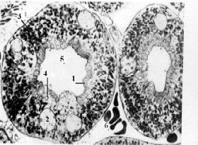 многочисленные митохондрии (3), концентрирующиеся, в основном, в базальной части клеток и отчасти обуславливающие базальную исчерченность. б) Кроме того, на снимке отмечены ядра (2) эпителиоцитов (имеющие округлую форму), просвет (5) канальца и кровеносный капилляр (6). | ||