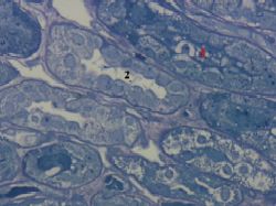 | 1,г. Препарат - почка; обычный (тонкий) срез. Окраска гематоксилин-эозином. | 2,б. Препарат - почка; полутонкий срез. Окраска толуидиновым синим. |