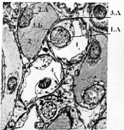 | Электрон- ная микро- фото- графия | Вышесказанное можно проиллюстрировать также электронной микрофотографией. а) На ней видны тонкие канальцы (1) и кровеносные капилляры (2). б) Те и другие содержат выбухающие в просвет ядросодержащие участки (1А и 2А), | Полный размер |