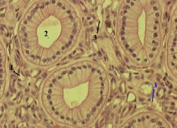 | Эпителий | а) Высота эпителия трубочек меняется по их длине: на уровне коры и верхних отделов мозгового вещества - однослойный кубический эпителий, ниже в мозговом веществе - однослойный призматическийэпителий (именно таков он на приведённом снимке). б) Видимо, это свидетельствует о большей функциональной активности нижних отделов собирательных трубочек (по сравнению с предыдущими отделами тех же трубочек). в) В эпителии трубочек – клетки двух видов: светлые и тёмные. |