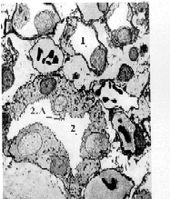| Электрон- ная микро- фото- графия | а) На приведённой микрофотографии - тонкие канальцы (1) и собирательная почечная трубочка (2). б) На апикальной поверхности клеток трубочек видны микроворсинки (2А). в) Но они расположены гораздо реже, чем в клетках проксимальных канальцев (см. выше), и не образуют поэтому щёточную каёмку. | Полный размер |