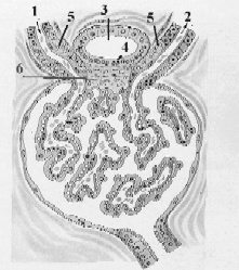 | а) плотное пятно(4) (macula densa) | - тот участок стенки дистального извитого канальца (3), который прилегает к почечному тельцу; |