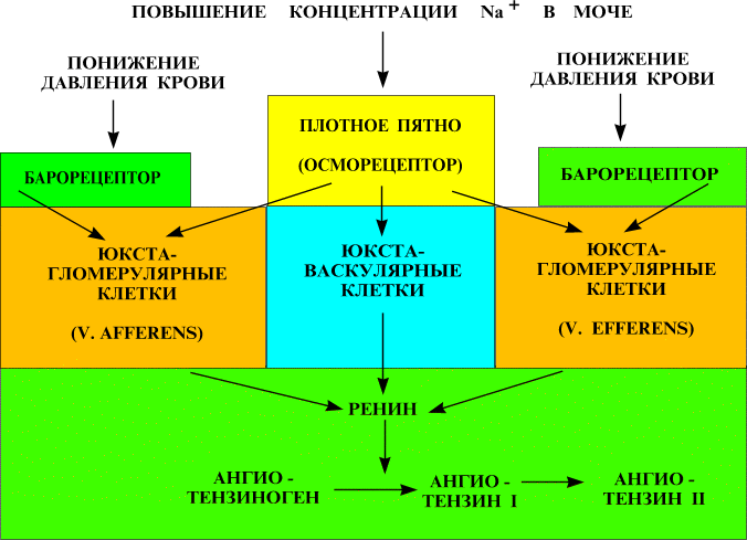 | Резюме | а) Из вышеизложенного вытекает, что ЮГА является рецепторно-эндокринным образованием. б) Причём, секреция ренина в ЮГА стимулируется в двух случаях: при раздражении осморецептора (плотного пятна), вызванном повышенной концентрацией Na+ в первичной моче, и при раздражении барорецепторов в ответ на снижение давления крови в почечных сосудах. в) Всё это подытоживается следующей схемой. |