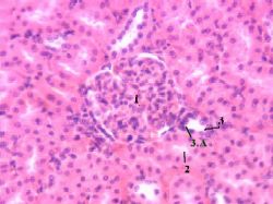 | 1,ж. Препарат - почка. Окраска гематоксилин-эозином. |
