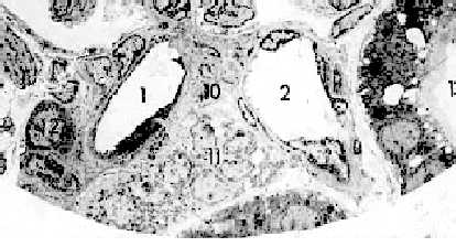 1. А здесь перед нами - нижняя часть снимка, приводившегося в п. 28.2.3.3.III. 2. Видны следующие структуры: приносящая (1) и выносящая (2) артериолы; | |