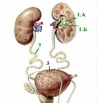 Рисунок - мочевые органы (у мужчины). Как уже отмечалось в начале темы, мочевыводящие пути можно подразделить на две группы: а) внутрипочечные - чашечки (1.А) и лоханки (1.Б), б) внепочечные - мочеточники (2), мочевой пузырь (3) и мочеиспускательный канал. | Полный размер |