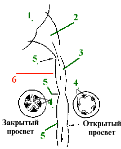 | Сужения мочеточ- ников | а) На протяжении каждого мочеточника (3), в т.ч. в его начале и в конце, имеется несколько сужений (5). б) В этих местах в стенке мочеточника (в подслизистой основе и мышечной оболочке) располагаются кавернозноподобные образования, КО (4), т.е. системы пещеристых (кавернозных) сосудов. | Схема - лоханочно- мочеточниковые сегменты. |