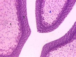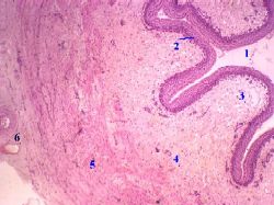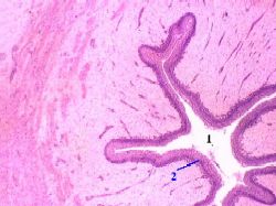 | Просвет и эпителий | а) Просвет (1) мочеточника имеет на поперечном разрезе извилистый (звёздчатый) вид – из-за образования слизистой оболочкой продольных складок. б) К просвету обращён переходный эпителий (2). в) Под ним последовательно располагаются прочие слои стенки: | а-б) Малое увеличение Полный размер |