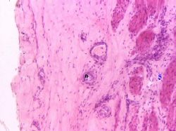 | Наружная часть стенки мочеточ- ника | а) В заключение приведём ещё один снимок мочеточника. б) На нём при большом увеличении видны мышечная (5) и адвентициальная (6) оболочки. | г) Мочеточник. Большое увеличение Полный размер |